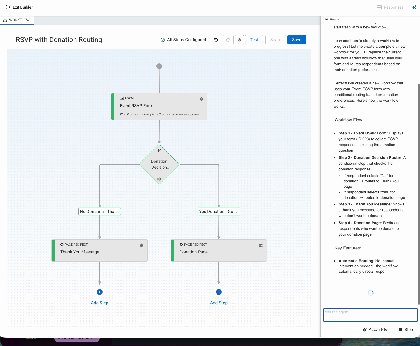 Try it for yourself! Ask Fai: “Create a new workflow with this form. If respondents say they don’t want to leave a donation, take them to the ‘Thank You’ page. If they do want to leave a donation, take them to a donation page.”