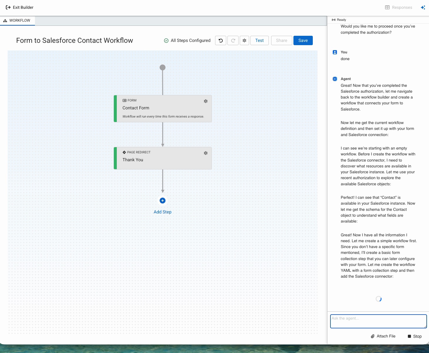 Try it for yourself! Ask Fai: “Add a Salesforce connection to the most recent form I’ve been working on. I want to create new contacts or update existing ones in Salesforce when the form is filled out.”