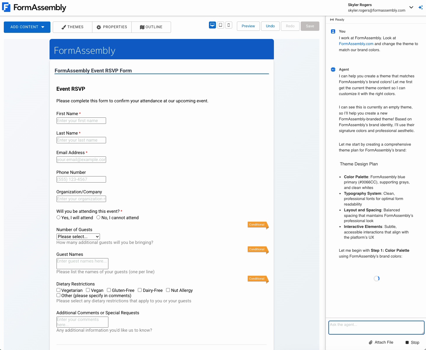 Try it for yourself! Ask Fai: “Look at my company’s website and change the theme of this form to match our brand colors.”